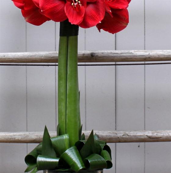 A modern and stylish red amaryllis arrangement presented in a glass cube. The perfect centrepiece.