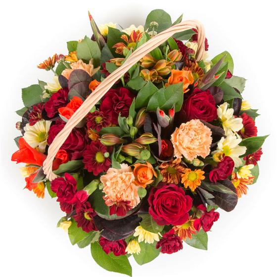 A rich mix of deep autumnal reds, rusts and golds. Including roses, spray carnations, alstromeria and chrysanthemums.