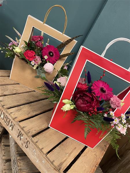 This eye-catching arrangement features vibrant pink roses and carnations, complemented by seasonal blooms and textured foliage, all artfully designed in a chic handbag-style box. Fresh, feminine, and full of personality, it’s a perfect gift for birthdays, celebrations, or anyone who loves flowers with flair. Please note: flower varieties and colours may vary slightly depending on seasonal availability, while the overall style and beauty of the arrangement will be maintained.