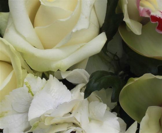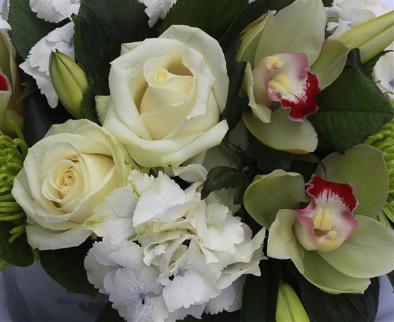 Cymbidium orchids, roses, shamrock blooms, oriental lilies and hydrangeas in shades of green and cream arranged in a leaf lined glass dish. Tres chic!