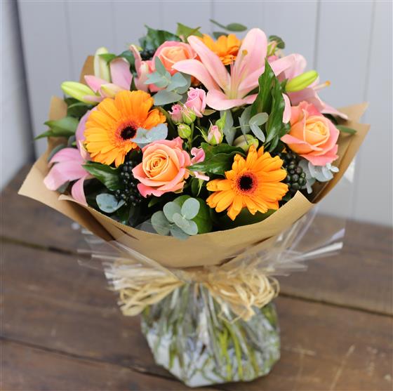 Pale pinks and Oranges combine to make up this beautiful hand tied.