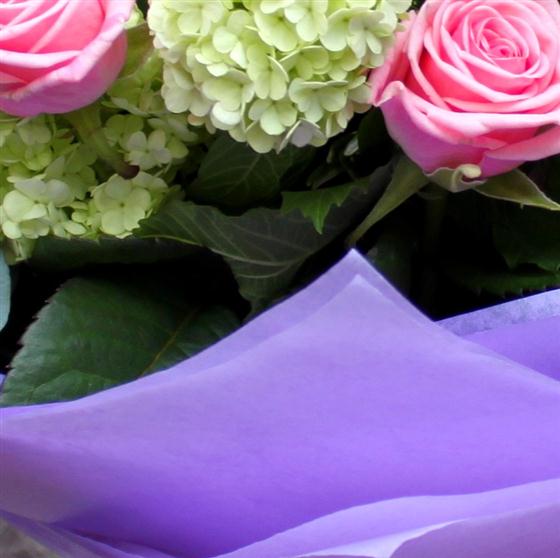 An unusual twist on the classic dozen roses. Pale lime green viburnum combines beautifully with 12 long stemmed pink roses and deep green foliage.