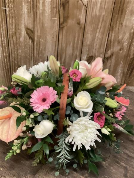 Choose from a range of colour options and we will create a traditional basket arrangement using seasonal blooms and foliage.