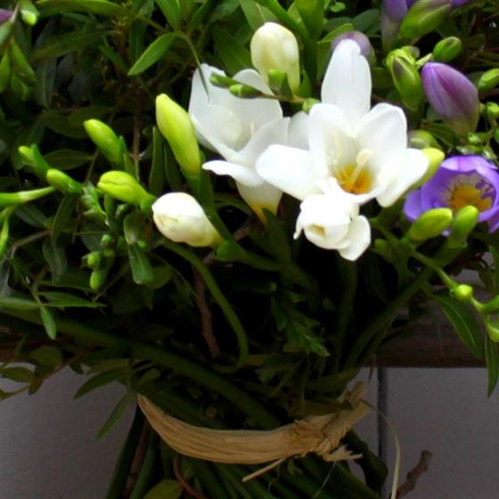 A hand tied bouquet of beautifully scented mixed freesia and seasonal foliage