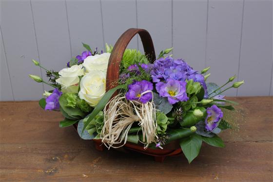 A garden trug basket filled with seasonal blooms. The perfect gift for any occasion.