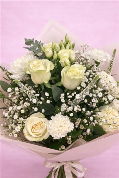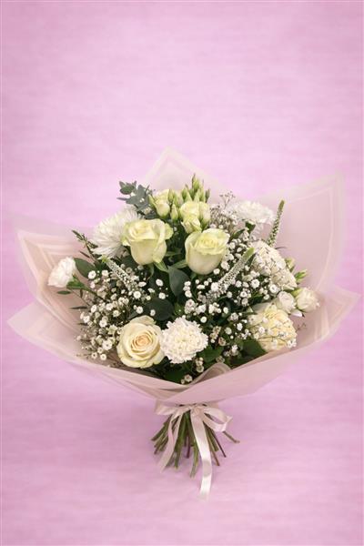 An elegant hand-tied bouquet in soft ivory tones and fresh seasonal greens. Premium cream roses are paired with delicate lisianthus, textured chrysanthemums and fine gypsophila, creating a beautifully balanced, timeless design.
