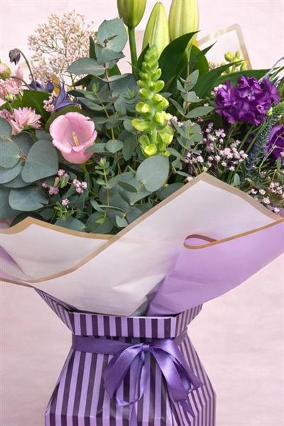 Featuring soft lilac and blush tones, complemented by fresh seasonal blooms, delicate textures and lush greenery, this beautifully balanced arrangement offers both depth and sophistication. Carefully handtied and presented in a stylish box with a water bubble for freshness and convenience.