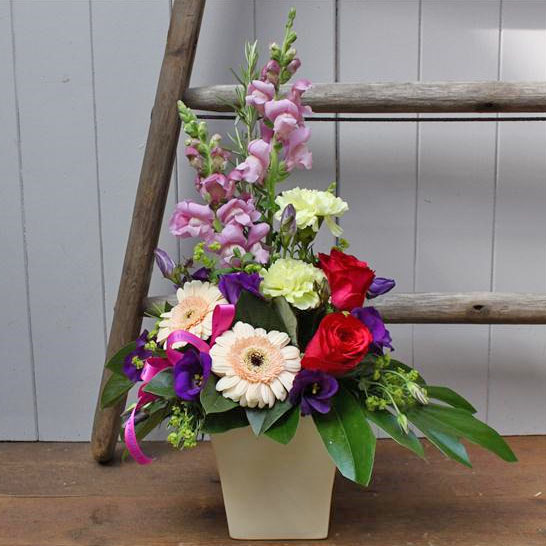 Antirrhinums, mini gerberas, roses, carnations and lisianthus expertly arranged in a ceramic container to create an elegant display.