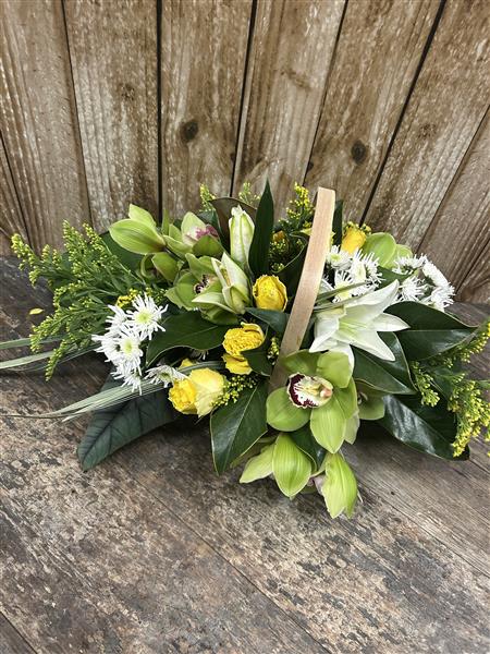 A beautifully balanced floral arrangement featuring elegant green cymbidium orchids, fresh white lilies, delicate white chrysanthemums, and cheerful yellow roses, accented with seasonal foliage and textured greenery. Designed in a natural, flowing style with a rustic handle detail.