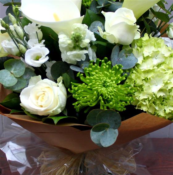 Simple and stylish, this white and green hand tied bouquet brings together arum lilies, roses, hydrangeas and shamrock blooms to create a classic option.
