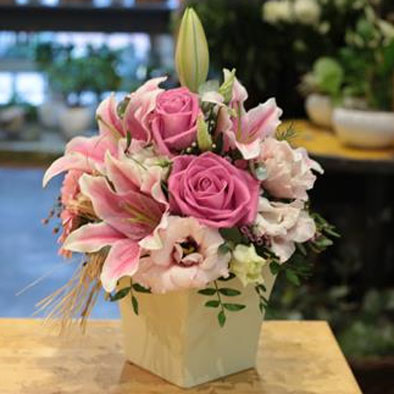 A scented arrangement of stargazer lilies, roses, lisianthus, wax flower and mixed foliage.