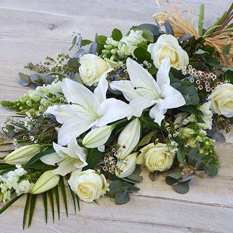 An elegant combination of fresh white tones and rich greens, featuring large ivory roses, oriental lilies, and silvery eucalyptus.