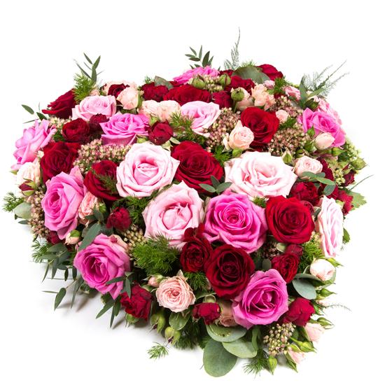 A collection of roses in varying shades and sizes, interspersed with sedum, eucalyptus and pittosporum.