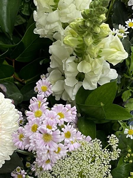 Soft pink Gerbera, Pink Roses, Pale Pink Lisianthus, Veronica and Beautiful White Snapdragons combine to make this beautiful hand tie.
