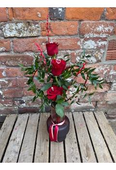 A striking and elegant arrangement of red roses displayed in a sleek vase, accented with flowing greenery and delicate red detail. Simple yet romantic, this design highlights the beauty of classic red roses, making it a perfect gesture for Valentine’s Day or a timeless expression of love.