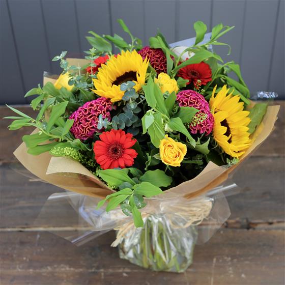 A bright and vibrant hand tie of sunflowers, celosia and roses.