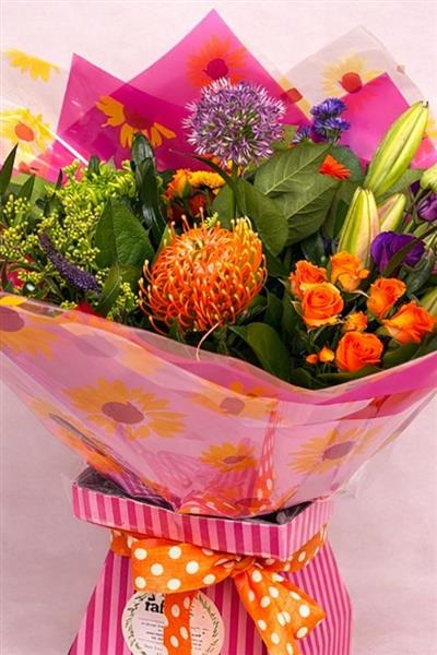 Featuring striking orange tones, bright seasonal blooms and fresh greenery, this eye-catching arrangement is handtied and presented in a stylish box with a water bubble for freshness and convenience.