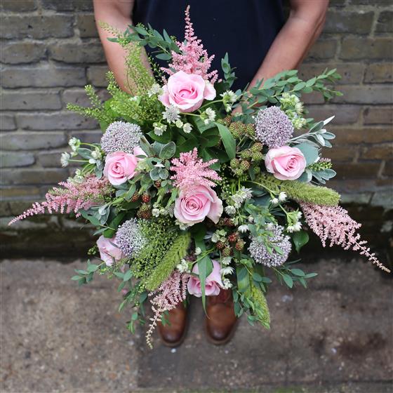 A hand tied of large headed pale pink roses and wild country flowers to suit.