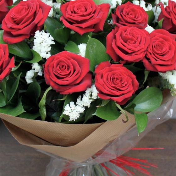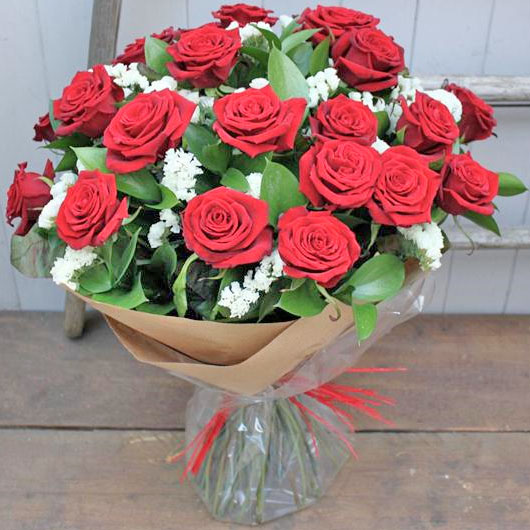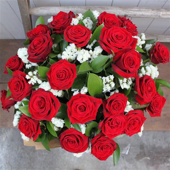 Make a statement with this extravagant bouquet of two dozen long stemmed velvety red roses and seasonal foliage.