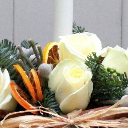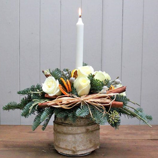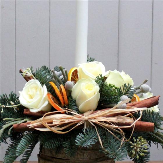 Birch covered container, scented spruce, cinnamon, white roses and brunia combine to make this beautiful Christmas table centre.