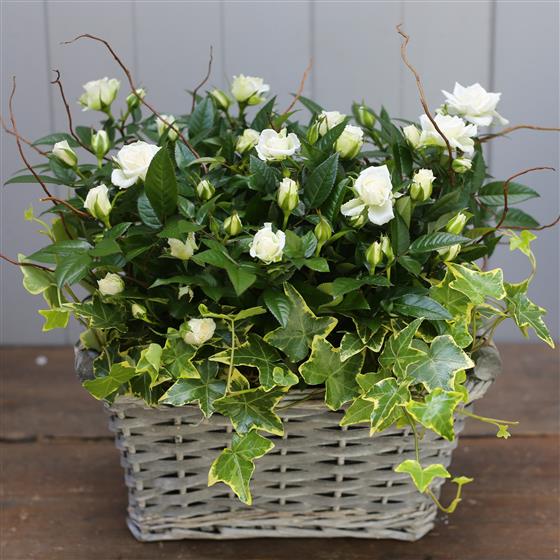 his grey wash fully lined and waterproof basket is filled with white rose plants and complimenting verigated ivy.