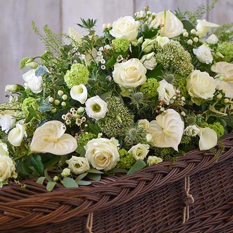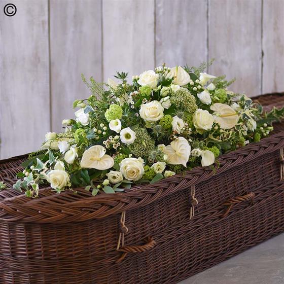 A beautiful casket spray in classic green and white colours, with the finest roses, calla lilies, anthurium and viburnum opulus.