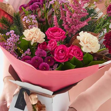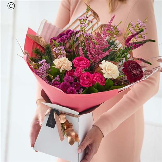 A beautiful bouquet handcrafted by their local florist featuring blooms in cerise and purple tones, with soft pink, peach or lilac shades. It might also feature dried flowers or foliage painted in copper or rose gold.